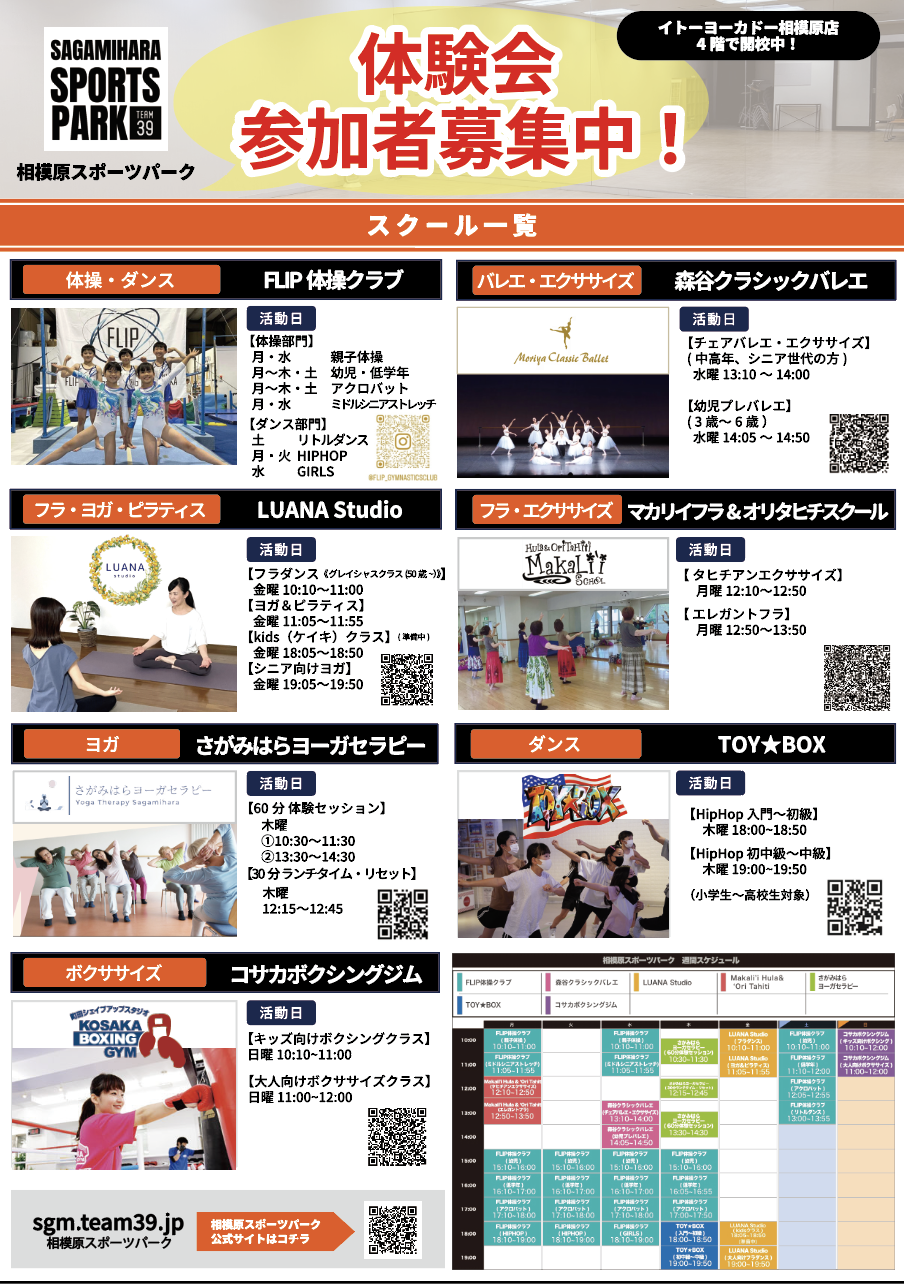 相模原スポーツパークスクール一覧 投稿日 2025年10月2日 更新日 2025年11月5日 著者 sagamihara spotrt park カテゴリー お知らせ 相模原スポーツパークでは様々なスクールが続々開校!是非遊びに来てください!体操・ダンス・バレエ・エクササイズ・フラ・ピラティス・ボクササイズなどキッズからシニアまで多世代に向けたスクール開校!