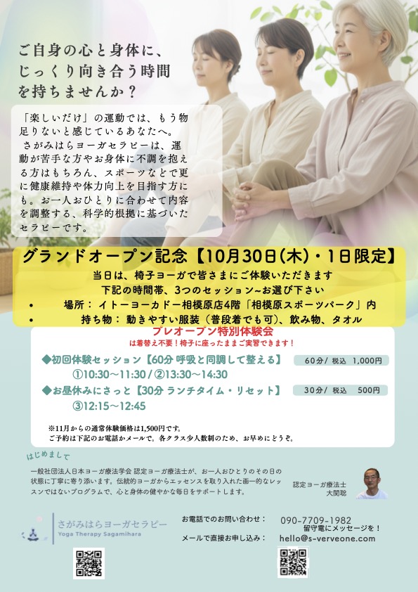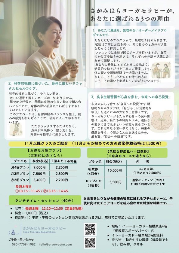 深い呼吸や、一人ひとりの体に合わせたやさしい動きを通して、心と体のバランスを整える、いわば「心と体のメンテナンス」 。
